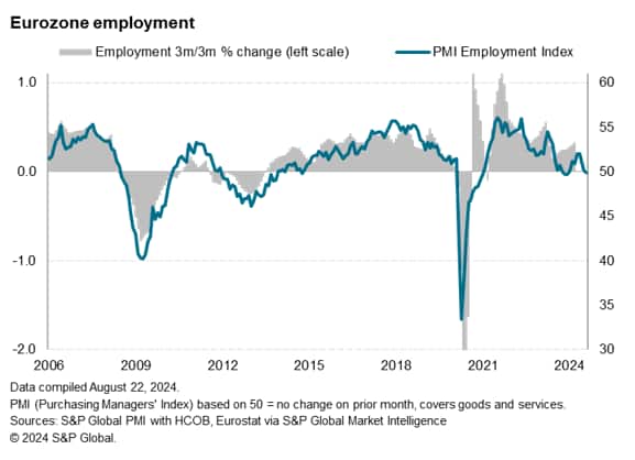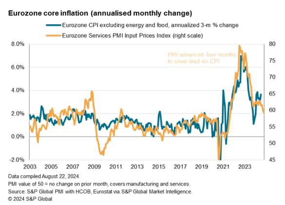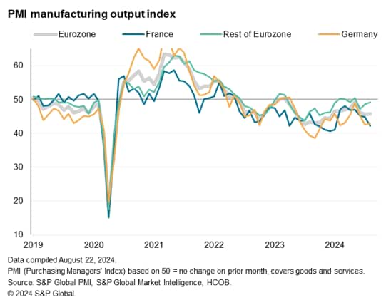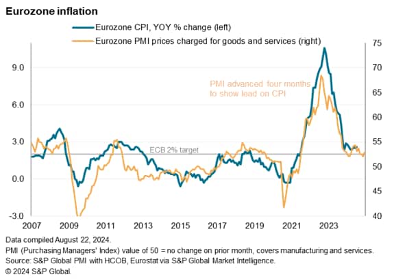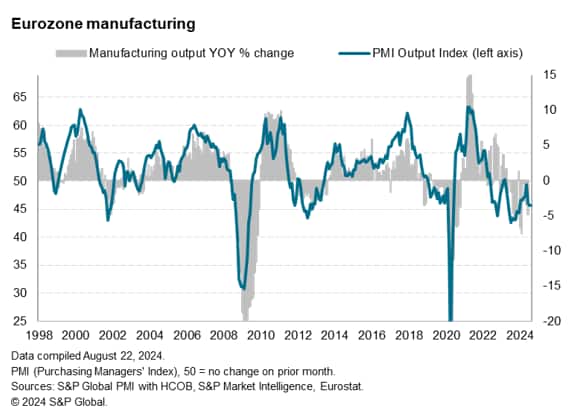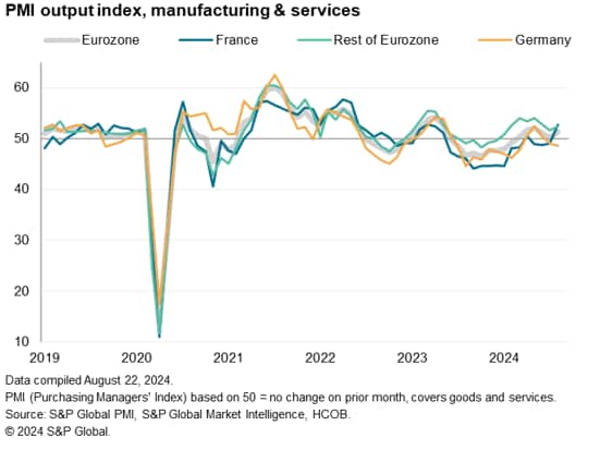 The August flash PMI corroborates S&P Global Market Intelligence's forecast for the eurozone to grow by a modest 0.8% in 2024, but this requires GDP to rise by almost 0.3% in the third and fourth quarters alike. This would clearly need the PMI to remain in growth territory and not fall back in September as some of the forward-looking data are hinting. September's PMI data will therefore prove important in confirming this outlook.