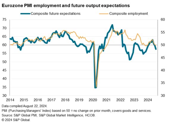 The growing reluctance to hire reflected a further worsening of business expectations about output growth in the year ahead, which fell for a third straight month in August to an eight-month low, dropping further below the survey's long-run average.