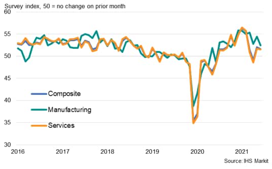 As a testament to the strength of the recovery in October, the backlogs of work index - a key indicator of capacity utilisation - also rose above the 50.0 no-change mark for the first time in four months across both services and composite gauges.