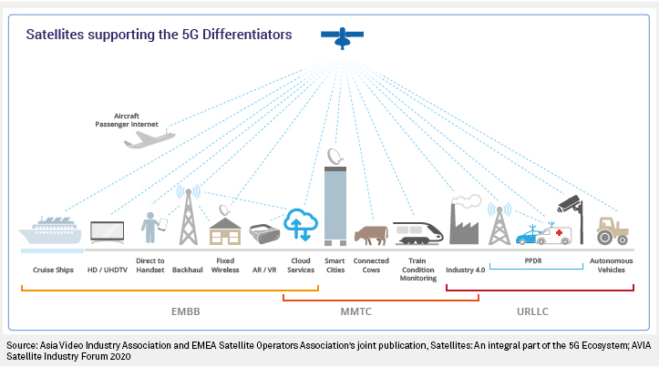 * Massive Machine-Type Communications (MMTC): Satellite's wide coverage finds the best use case in massive-scale connectivity, such as industrial internet of things, connected vehicles — especially in remote areas — and connected sensors.