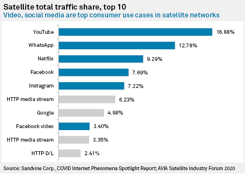 Satellites are popularly known to be inadequate for some use cases, such as high data throughput video streaming. Holla-Maini countered this by citing a recent report published by Sandvine Corp. highlighting various use cases serviced by satellite networks during the COVID-19 pandemic. In the report, the top use cases in satellite networks in terms of total traffic share are everyday general activities such as social media use through Facebook, WhatsApp and Instagram and video streaming through YouTube or Netflix.
