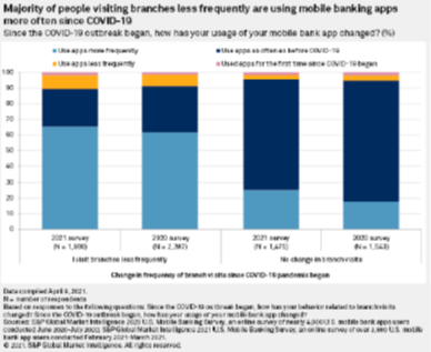 Nearly 52% of respondents to S&P Global Market Intelligence's annual consumer mobile banking survey, conducted in February and March of 2021, indicated that they were visiting branches less frequently since the pandemic began. Among those respondents, more than 65% were also using their mobile apps more frequently during the same time frame.