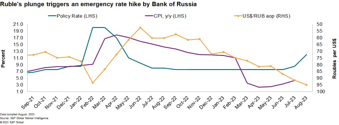 We projected that an emergency rate-setting meeting would be called in August to raise the key rate from 9.5% to 11%. The CBR opted for an even larger rate increase on Aug. 15, pushing the key lending rate to 12%. The move follows a 100-basis-point rate hike in July.