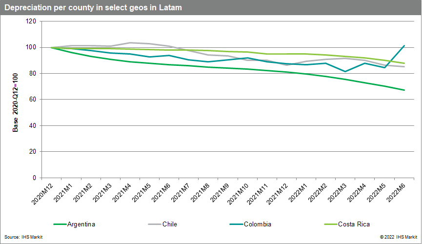 Exchange rate depreciations affecting direct and indirect foreign exchange risks in Argentina, Chile and Costa Rica.