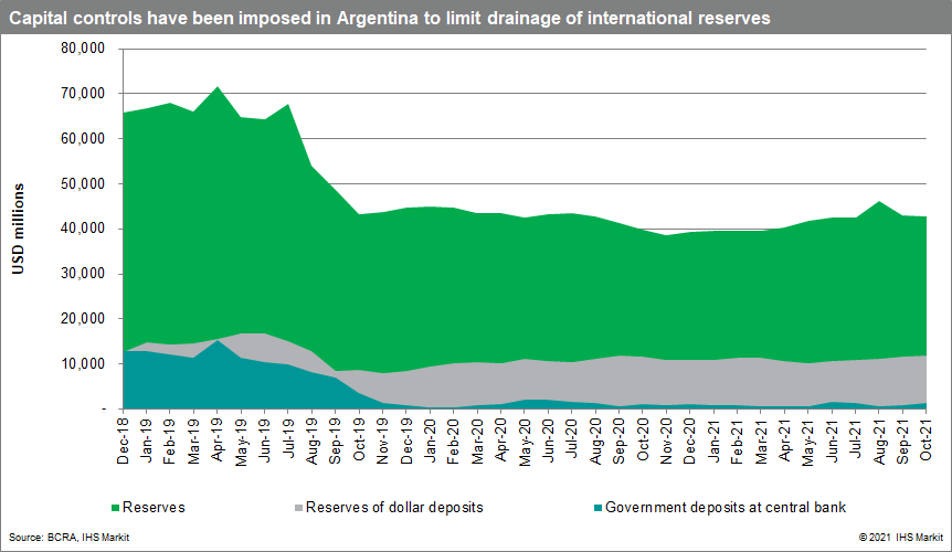 Argentina's tight sovereign debt position and foreign exchange depreciation have led the government to impose tight capital controls since 2019. So far, these have not affected banks directly, but slowly the central bank has issued directives asking the sector to reduce demand for dollars; the latest one is a temporary freeze on the net open foreign exchange position in the sector. Our experts expect that as the reserve situation continues to deteriorate in the country, more capital controls directly affecting banks will be imposed on the banking sector.