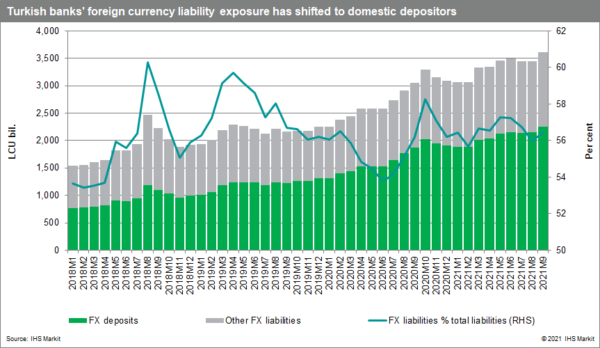 All eyes will remain on Turkey in December after the lira's slide against the US dollar intensified in November. Even assuming the lira stabilizes, downside risks are now higher and markets are expected to react sharply to anti-interest-rate statements. The risks of another rate cut at the Central Bank of the Republic of Turkey's 16 December meeting are rising rapidly, a move that would escalate the current lira sell-off and put even more pressure on bank capital buffers, profitability, and debt-servicing capacity amongst bank borrowers. The most likely path towards a lira recovery before the end of the year would be for an about-face from the central bank and an emergency rate rise, but even that is unlikely to move the lira back to levels recorded just three months ago. Dollarization in Turkey's banking sector is expected to intensify as depositors seek protection from rising inflation and the weaker lira. Requests from large corporations that have borrowed in foreign currency to seek another round of restructuring on outstanding debt or a jump in the interbank offered rate would be clear signs that currency instability is having a more immediate impact on the banking sector.