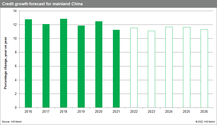 After the central bank cut both the short-term and the medium-term loan prime rates in recent weeks, IHS Markit experts judge it likely that considering the reserve requirement ratio (RRR) is still at around 8.4% after it was reduced in December 2021, there is room for a further cut in the first quarter. Overall, we expect credit growth in mainland China to be around 11.6% in 2022.