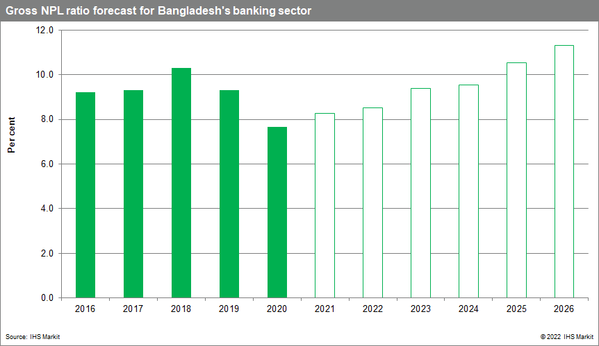 At the end of 2021, Bangladesh authorities had shown willingness to relax the minimum loan-repayment requirement for a loan to be classified as normal; this policy will likely continue into 2022. Although the regulators may show resilience and a strong stance towards better loan classification, in the beginning, IHS Markit experts expect these will once again relax. We expect the non-performing loan (NPL) ratio to remain around 8.3% for 2022.