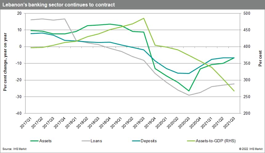 In October 2021, Lebanon contracted with a third-party auditor to estimate the size of the BDL's debt burden and potential losses. Originally contracted for completion within 12 weeks, the audit by Alvarez and Marsal could be completed in February, having reportedly been delayed because of a lack of BDL responsiveness to data requests. Quantifying the scale of BDL losses is a critical first step in Lebanon restarting stalled talks with the International Monetary Fund (IMF) seen as needed to restructure the banking sector. IHS Markit experts previously noted that sovereign debt holdings (10% of total assets) and deposits at the BDL (60% of total assets) make up most of the banking sector's assets. Based on recent government payments, we estimate that a de facto reduction of 50% on local currency-denominated debt and 92% on foreign currency-denominated debt has already occurred - a likely indication of what could be considered sustainable going forward.