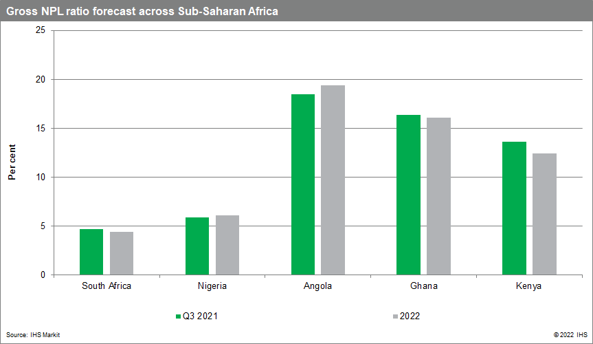 At the onset of the pandemic, most countries in Sub-Saharan Africa adopted an accommodative monetary policy to support their economies. However, because of significant inflation risks, IHS Markit experts forecast risk to interest rates in some of Sub-Saharan Africa's largest economies, namely Angola, Ghana, Kenya, Nigeria, and South Africa, to be towards the upside for 2022. We forecast an average NPL ratio of 11.7% for these five countries for 2022 and significant interest rates hikes, at a time when these countries are already battling with asset-quality challenges (particularly Angola, Ghana, and Kenya) because of legacy problem loans and ongoing stresses related to the pandemic. In addition, further interest-rate hikes will push banks to lend more to the sovereign, which in the case of Sub-Saharan Africa is already at a notable level.