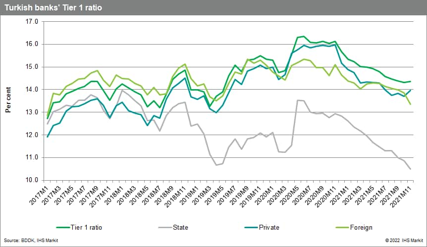 Turkey's sovereign wealth fund (Türkiye Varlık Fonu Yönetimi: Turkey Wealth Fund, or TWF) is likely to inject capital into the country's three state-owned banks in the first quarter to maintain expansion capital and boost capital buffers that have been eroded by rapid lending and higher risk-weighted assets. Not yet announced officially, the TWF is rumored to be considering a TRY51.5-billion (USD3.8-billion) capital infusion into state-owned banks including Ziraat Bank (TRY22.5 billion), Halkbank (TRY13.5 billion), and Vakifbank (TRY13.5 billion), which we expect to occur before the end of the first quarter. Although still above local requirements (Tier 1 minimum of 8.5% including capital conservation buffer), state-owned banks have the lowest cushion when compared with private and foreign-owned banks. In light of low profitability, we expect credit growth to be curtailed if state-owned banks do not receive capital injections soon.