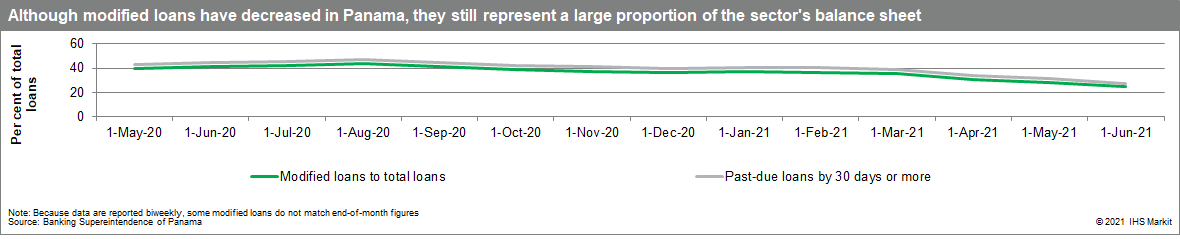 Panama's last wave of renegotiation expired at the end of September 2021. The original set of measures was established at the beginning of 2020 and allowed banking customers to both refinance and delay their loans at no cost to banks. These measures were originally planned to end in the second half of 2020, but have instead been extended repeatedly given that regulators assess that vulnerabilities still exist in the sector. Although the expiration of the program is unlikely to bring an immediate rise in impairment (mainly because the last wave of forbearance allowed banks to delay loans until the end of 2021), IHS Markit experts will be observing the decisions that banks make to control the realization of bad asset quality in their balance sheets.