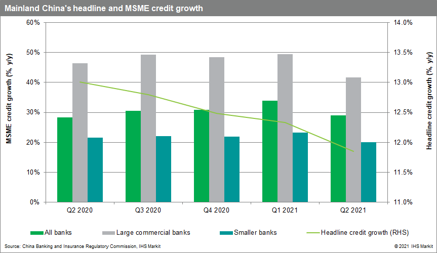 The lowering of the reserve requirement ratio (RRR) in mainland China - which was not targeted to boost micro, small, and medium-sized enterprises (MSME) lending - will likely result in broad-based credit growth in the coming quarter. Although the RRR was not targeted, the MSME loan target and ongoing scrutiny on real estate sector loans will likely support a concentration of loans in the household and MSME segments. IHS Markit maintains the view that more regulatory controls will be likely for the real estate sector, on both the development and mortgage fronts.