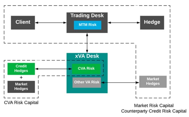 If we look at the schematic of a typical investment bank setup (Figure 1), at the top are the trading desks, which are doing business with customers and then hedging the mark-to-market risk of those derivative transactions with other dealers or central counterparties through hedges. And it's generally that activity that is covered by the market risk capital framework and the counterparty credit risk capital framework.