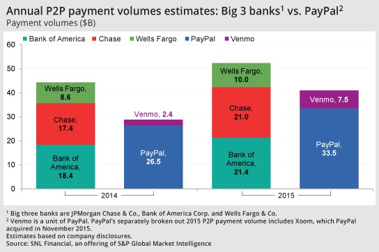 In the second quarter of 2016, each of the big three banks disclosed person-to-person payment volume details for the first time, enabling estimates of each bank's respective person-to-person volume for 2014 and 2015.