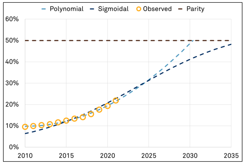 Figure 1: Women’s Representation Rate in Senior Leadership Positions, Russell 3000, 2010-2021 (Actual); 2022-2035 (Extrapolated)