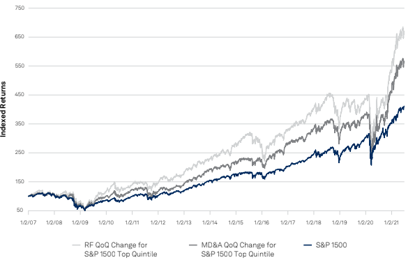 The simulated strategies for period 2007 through June 2021 outperform the S&P 1500 as a benchmark: