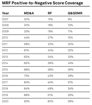 Natural language Processing[3] (NLP) is leveraged to transform and quantify the MRF dataset, wherein the Loughran-McDonald Master Dictionary is chosen to support this paper’s sentiment-based analysis[4] It should be noted that this is also the dictionary used in the Textual Data Analytics (TDA) product built using the Machine Readable Transcripts dataset.