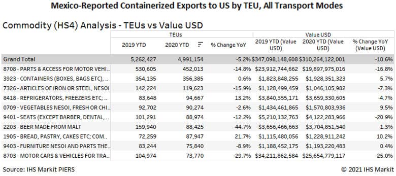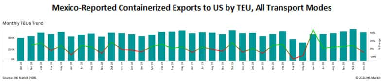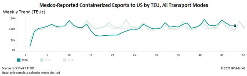 Thinking back to the uncertainty affecting the trade outlook in early 2020, it is interesting to note that aggregate containerized export volumes from Mexico to the US are down less than 5% over 2019 levels YoY.