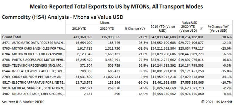By USD value, the top five Mexico export commodities for YTD 2020 are in the areas of data processing machines, motor vehicles and parts, Insulated wire and cable and crude oil. Exports of passenger vehicles (HS 8703) fell 25% YoY. Automatic data process machines (HS 8471) grew 12.1% YoY for the same comparison period.