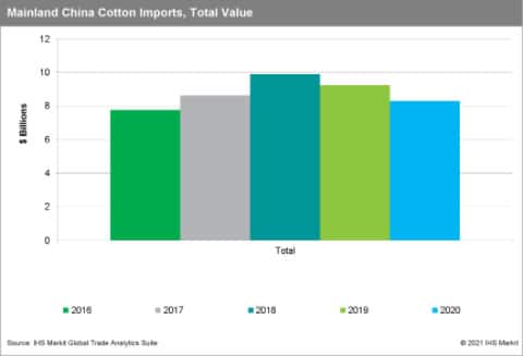 Taking a high-level view for the past five years for cotton imported into mainland China, we see values peak with 2018 imports at nearly $10 billion before tapering down in pandemic-era 2020 to $8.3 billion.
