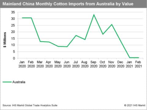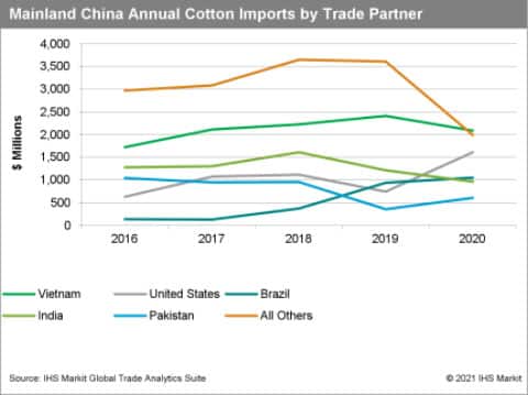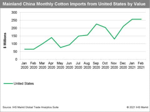 U.S.-sourced cotton increased dramatically beginning in July 2020, continued throughout the year and into the early months of 2021. The initial increase is attributable to mainland China's commitment to purchase more U.S. goods under the Phase 1 trade agreement. The subsequent COVID-19 pandemic and related shutdowns in production and retail sectors made the purchases seem excessive at the time. However, despite that initial assessment, imports from the United States continue strong growth into the early months of 2021 as mainland China looks to increase international sourcing given current concerns of domestic sourcing practices in the Xinjiang region.