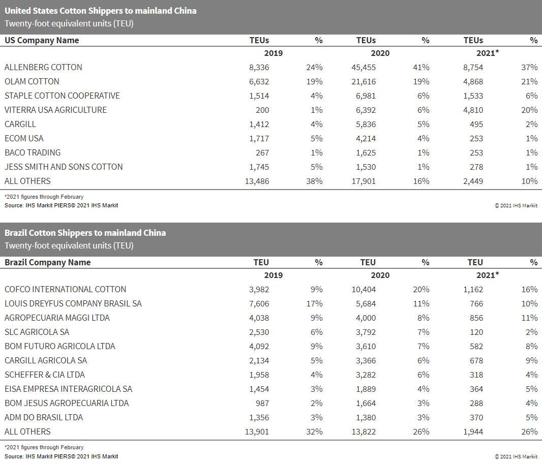 Taking a deeper dive into transactional trade data sets available from IHS Markit analyzing top shippers of cotton from strong growth source countries such as the United States and Brazil, shows a concentrated group of companies within each respective country providing cotton: