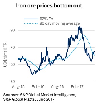 S&P Global Market Intelligence expects iron ore prices to remain at relatively elevated levels through Q3 2017, as Chinese steel making continues apace and the country's appetite for imports absorbs short-term increases in global ore production. The iron ore price has averaged US$66/dmt CFR in July so far, based on S&P Global Platts IODEX. There appears to be little to suggest significant near-term weakness for mid-to-high grade iron ores. We do, however, assess risks to be skewed to the downside. Hence, our Q3 average price expectation is slightly lower than prevailing levels, at US$63/t.