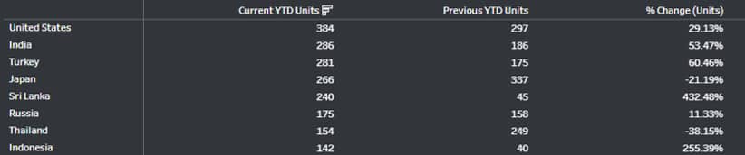 Figure 2: YTD (January plus February) 2020 comparison to 2019 ranked by current YTD units (Tons) by trade partner. Source: IHS Markit Global Trade Atlas