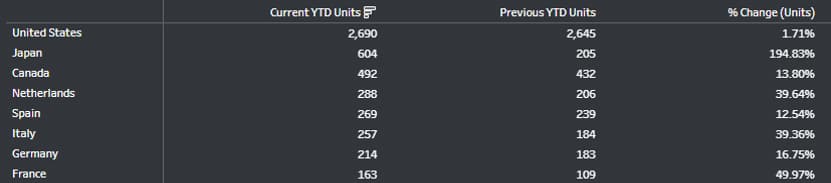 Figure 3: YTD (January plus February) 2020 comparison to 2019 ranked by current YTD units (Tons) by trade partner. Source: IHS Markit Global trade Atlas