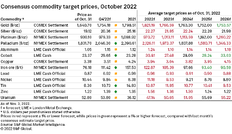 Review S&P Capital IQ Pro consensus price forecasts for industrial and precious metals, including platinum group metals, amid broader market trends. Consensus metals prices for 2022 and 2023 were all downgraded as risks of a global recession intensify following further interest-rate hikes in major economies.