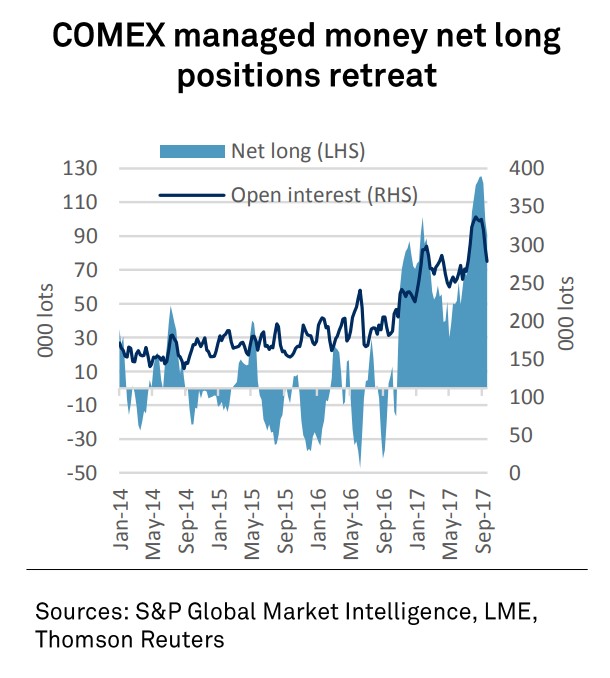 We had indicated that the earlier copper price rally was largely driven by speculator interest, which inflated prices and detached them from the underlying fundamentals, leaving copper overbought and vulnerable to the long liquidation that ensued. COMEX data show that managed money net long positions hit a record high of 125,372 lots September 5. LME money manager net long positions reached a recent peak of 78,527 lots on August 29, but had fallen 28.0%, or 21,976 lots, by the end of September. Over the same period, LME three-month copper prices retreated 4.6%.