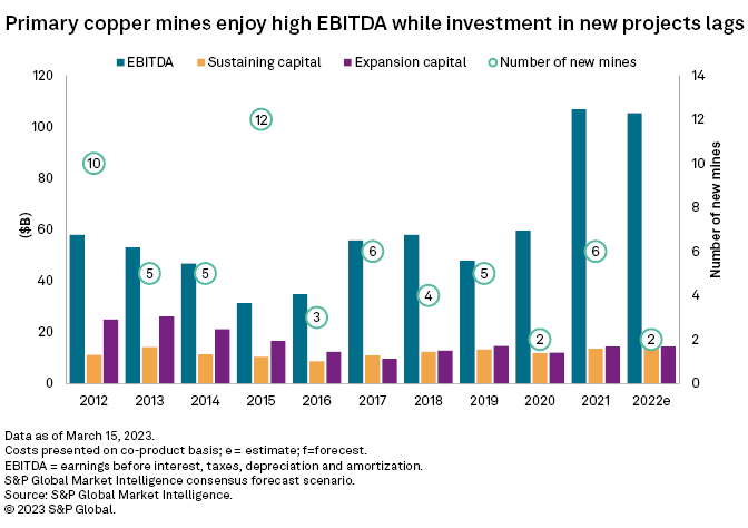 Copper prices have largely rebounded after bottoming out in the COVID-19 period. EBITDA for copper miners exceeded the 2012 peak for the first time in 2021, supported by recovering copper prices and tighter capital management by miners. Nevertheless, capex is lagging; we project a 0.1% decline in capex year over year in 2022. We expect development capex to decrease further in 2023, while EBITDA increases 12.9% year over year to $118.86 billion, mainly due to lower operating costs.
