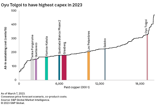 Oyu Tolgoi is expected to have the highest capex in 2023. Underground commercial mining began March 13, with a development capex of approximately $7.06 billion and sustainable production of approximately 500,000 t/y from 2028 to 2036 from the open pit and underground.