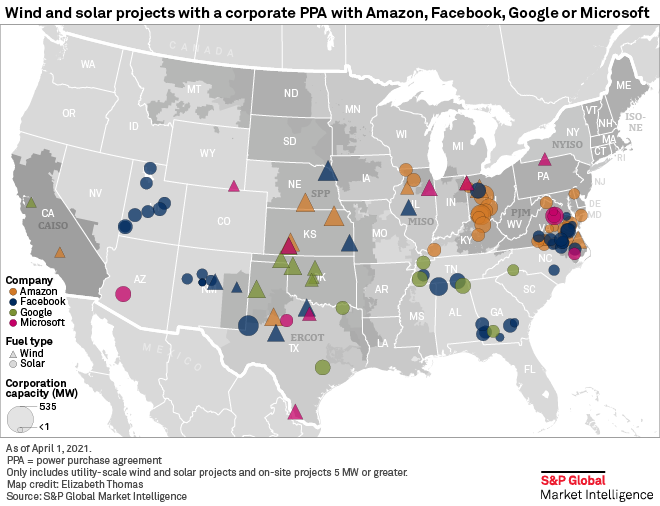 Microsoft Corp. has nearly 2,700 MW of corporate renewable capacity in PPAs in the U.S., the Netherlands, Singapore and Ireland. Its largest PPA signings to date include the 225-MW Pleinmont Solar II (Spotsylvania Solar Energy Center) project in Virginia, the 178-MW Bloom Wind Power Project in Kansas and the 175-MW Pilot Hill Wind Project (K4 Wind Farm) in Illinois. In 2020, Microsoft announced a portfolio addition of 500 MW of solar capacity across the U.S. with developer Sol Systems.