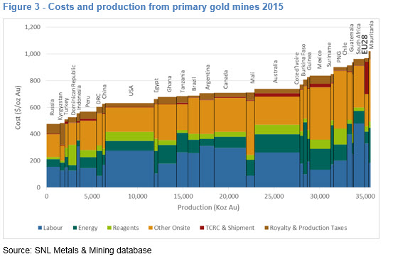 Figure 3 illustrates the relative position of the EU28 gold producers on the global cost curve. The region is located on the extreme right of the horizontal axis, indicating its relatively high operating costs compared to all other countries reviewed.