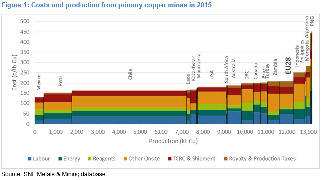 With the exception of copper in Poland, royalty and tax costs within the EU28 are generally more competitive than other countries. Other cost elements in EU28 mines are also generally similar to the average costs from other regions of the world. Mines operating within the EU28 benefit from being close to and having access to good infrastructure.