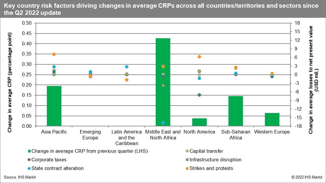 Conversely, Sri Lanka recorded one of the largest deteriorations in the CRPs since the second-quarter update, increasing by 4.78 percentage points to 6.86%. The increase in Sri Lanka's CRP was driven by rising costs of strikes and protests, as well as recession, in response to major political and economic dislocation this year.