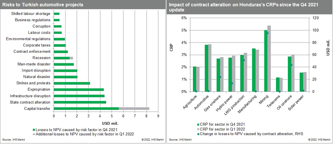 Turkey's local currency the lira fell by almost 50% in 2021, was supported by the Turkish central bank (TCMB) pausing its rate-cutting cycle in January and February, as well as a series of TCMB interventions and a currency swap since mid-December which have stemmed the currency's collapse since easing started in September. IHS Markit expects this rate-cutting cycle to be paused for a few more months, however, the lira remains vulnerable to sharp losses, raising the risk that restrictions are placed on capital outflows and/or currency convertibility. Given an increase in our capital transfer risk score, the CRP for an automotive project in Turkey increased by 0.34 percentage point to 3.25% since the fourth-quarter 2021 update - the second-highest CRP after mining.