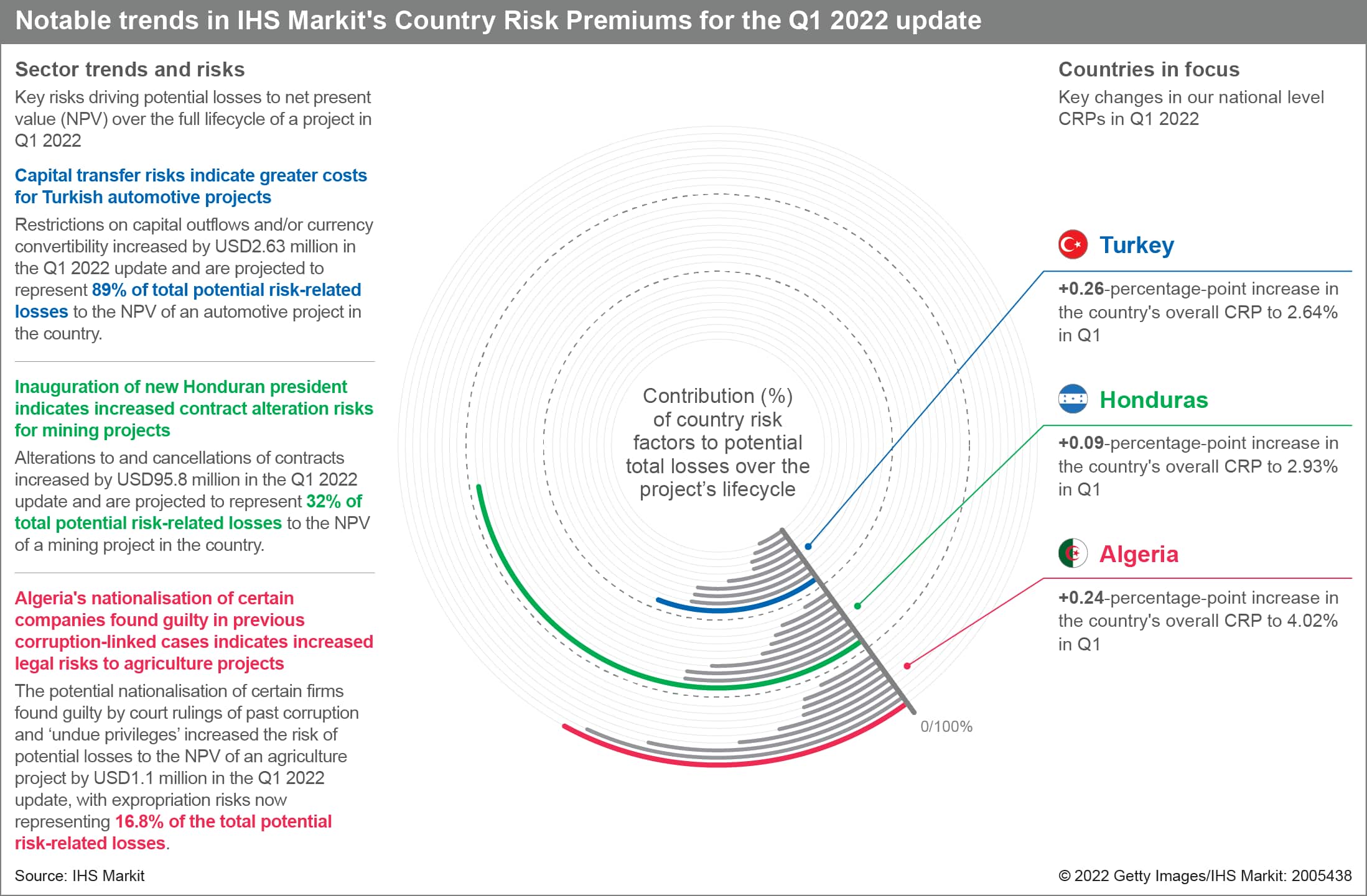 The additional rate of return needed to adjust for country risk over the full lifecycle of a project, as reflected in our Country Risk Premiums (CRPs), increased most notably on average in two sectors for this first-quarter update: onshore gas and onshore oil. The increases since the fourth-quarter update were driven by costs associated with capital transfer and expropriation risks over the full lifecycle of a project, particularly those located in Ethiopia, Mozambique, and Turkey.