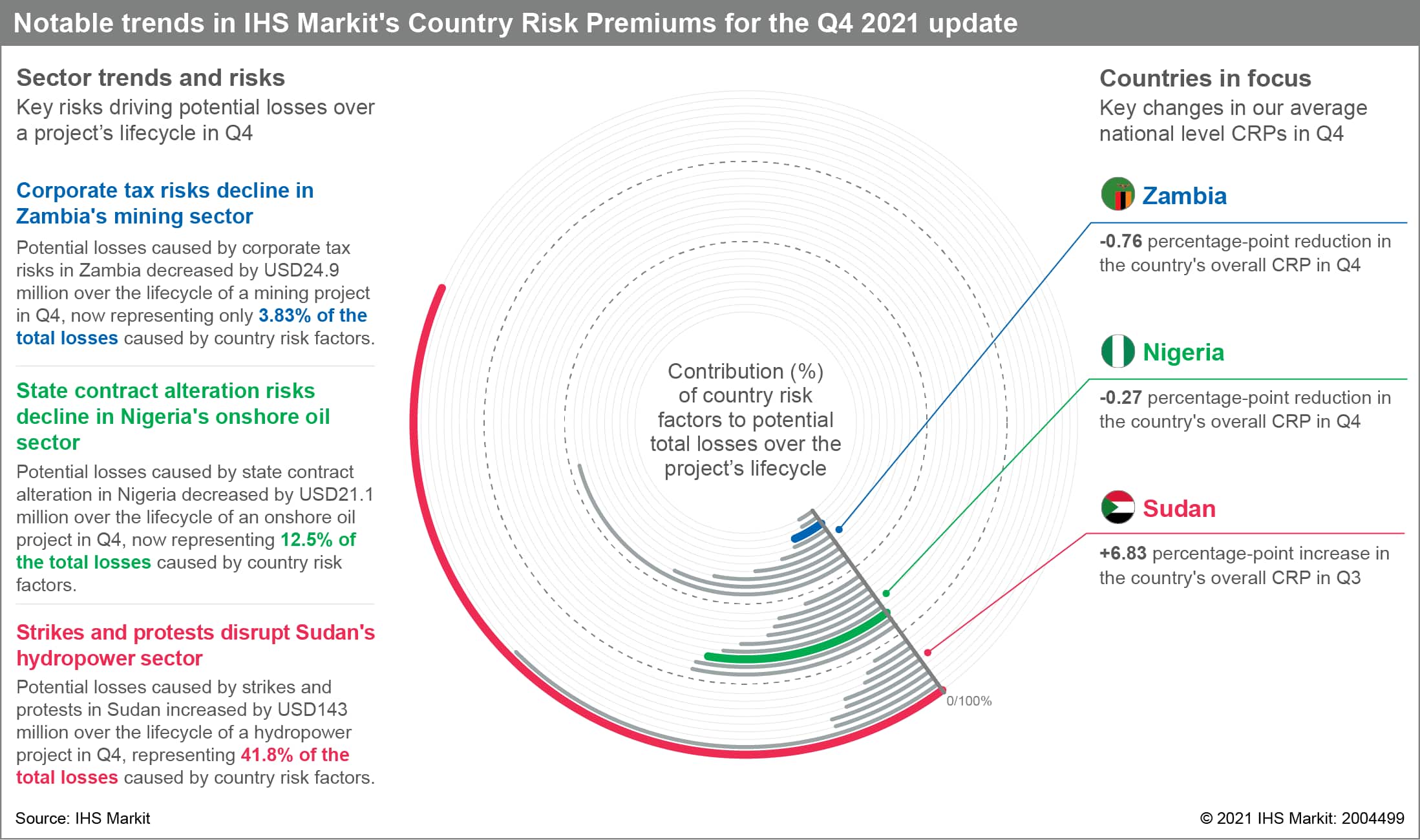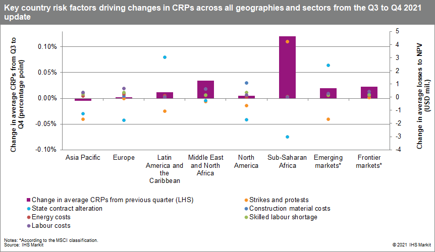 Projects located in sub-Saharan Africa have recorded the largest increase in Country Risk Premiums (CRPs) since the third-quarter update, as estimated by the Country Risk Investment Model (CRIM). The CRPs increased by 0.12 percentage point on average across all geographies and sectors, making it the region with the worst average CRP overall for this fourth-quarter update. The key driver for the deterioration in sub-Saharan Africa's CRP is a significant increase in the risk of strikes and protests since the third-quarter update, particularly in Sudan, which added USD4.2 million to potential losses in net present value (NPV) over the full lifecycle of a project located there.