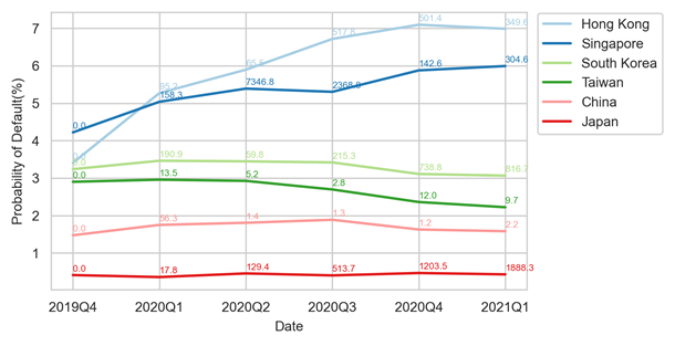 PDFN 2.0 Public is a fundamentals-based statistical model that produces PD values and mapped credit scores for publicly-listed companies across the globe.[1] [2] Figure 1 shows the country/region median PDs generated by PDFN 2.0 for public companies in Hong Kong, Singapore, South Korea, Taiwan, China and Japan from 2019Q4 to 2021Q1. Due to the differences in country/region risk scores and industry compositions, the absolute median PD values vary. However, if we compare the PD trends against each country/region, the surge starting from 2020Q1 in Hong Kong, Singapore, South Korea and China indicates they had all been hit severely by the coronavirus. For example, Hong Kong’s median PD increased from 3.4% to 5.3%, with 95.2 new cases per million population in 2020Q1. China, where the coronavirus first broke out, also experienced an overall deterioration in creditworthiness, with its median PD increasing from 1.5% to 1.8%.