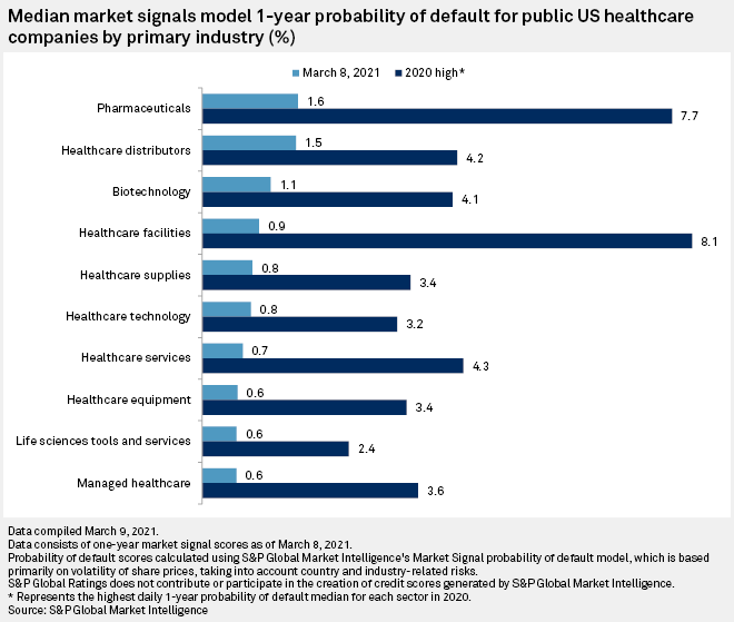 The healthcare industry was both deeply impacted by COVID-19 and tasked with mounting an effective response to it. As a consequence, probability of default scores fell for all segments of healthcare in Q1 2021 compared with their highs in 2020.