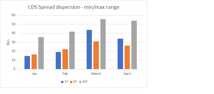 The increase in dispersion due to the crisis is underlined by figure 3. It shows the average range between minimum and maximum CDS contributions for 2020 month-ends (we have taken a pre-month-end snapshot for April).