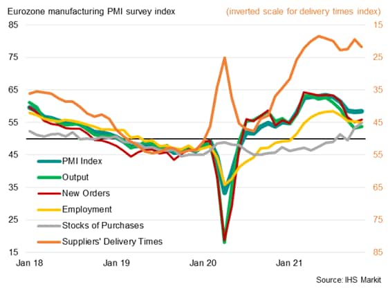 - At first glance, manufacturers in the eurozone had a bumper month in November. The IHS Markit Eurozone Manufacturing PMI increased from 58.3 in October to 58.4, marking the first rise in the headline index since June. The latest reading was not only far above the 50.0 no change level, but also almost seven points higher than the survey's per-pandemic long-run average of 51.7