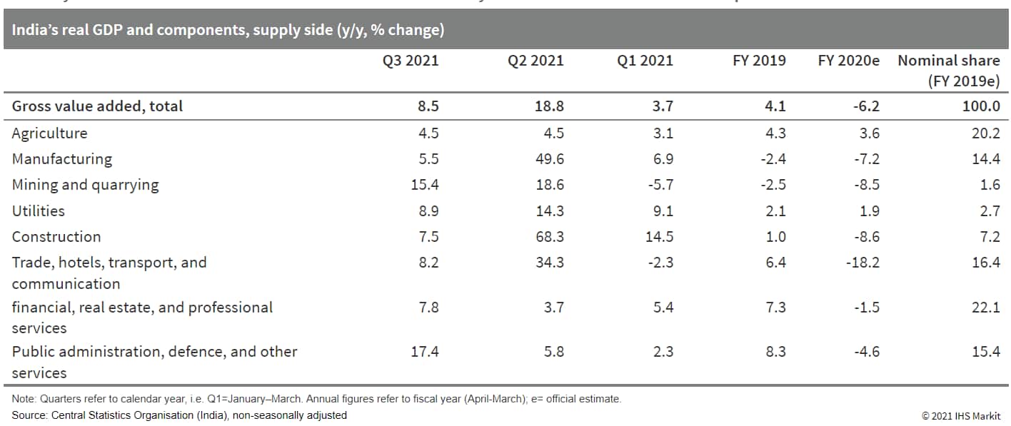 - India's GDP growth rebounded to 8.4% y/y in September quarter as disruptions ease after second wave of COVID-19. Easing lockdown restrictions, faster vaccination progress, and improving sentiment moved India's economy towards greater normalization in the June-September quarter - the second quarter of the fiscal year 2021 - after the recovery was interrupted by the second wave of the COVID-19 pandemic in the first fiscal quarter. The recovery is set to continue in the second half of the fiscal year, but momentum may slow amid persistent supply constraints and rising prices, particularly in the energy sector. The resurgence of the pandemic also remains a risk. (IHS Markit Economist Hanna Luchnikava-Schorsch)