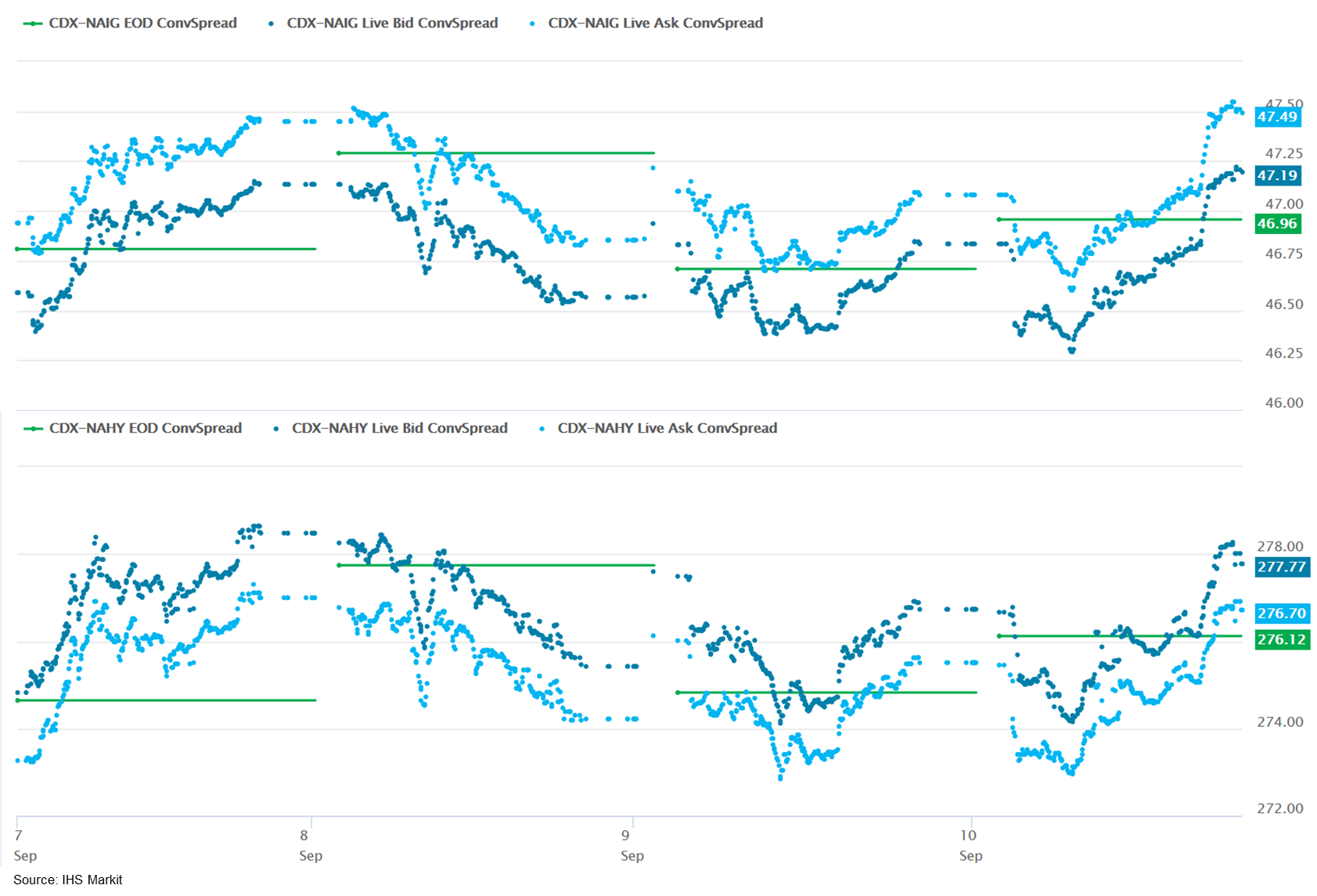 - CDX-NAIG closed flat/47bps and CDX-NAHY +1bp/277bps, which is flat and +2bps week-over-week, respectively.