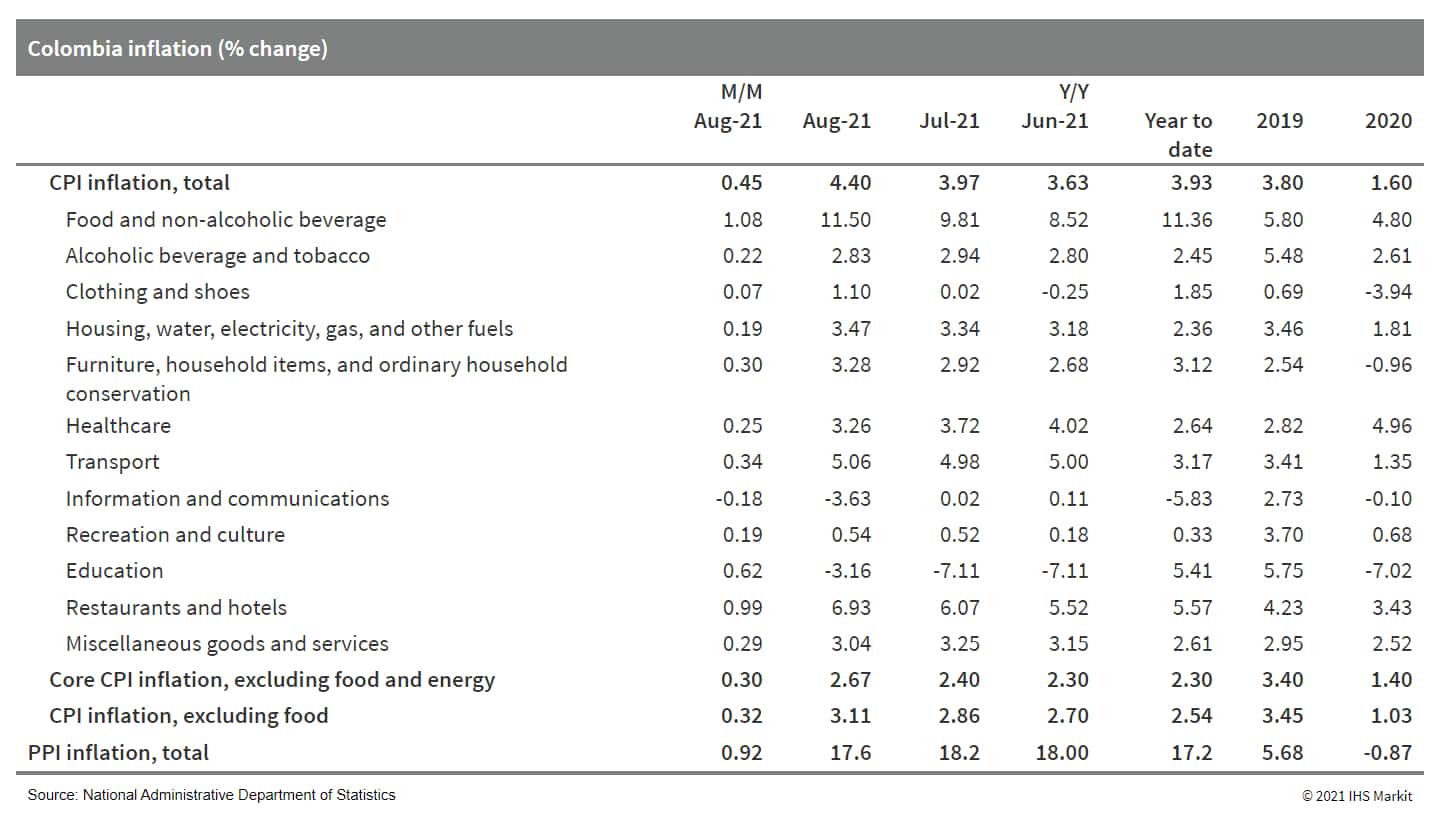 - According to Colombia's National Administrative Department of Statistics (DANE), the country's consumer price index (CPI) rose from 4% year on year (y/y) in July to 4.4% y/y in August as IHS Markit expected, taking the headline rate even further above the mid-point of the Banrep's target. The bank targets inflation at 3.0% +/- 1 percentage point. (IHS Markit Economist Rafael Amiel)