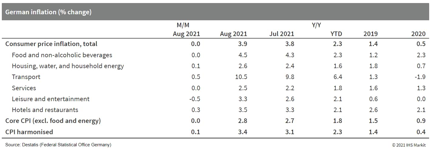 - German consumer price index (CPI) inflation increased slightly further in August following July's pronounced jump, which had been exacerbated by a value-added tax (VAT) base effect. Inflation will fluctuate around the 4% level until the end of 2021 before unwinding base effects allow a calming to around 2.5% in 2022, notwithstanding lingering pipeline pressures linked to supply-chain disruption. (IHS Markit Economist Timo Klein)