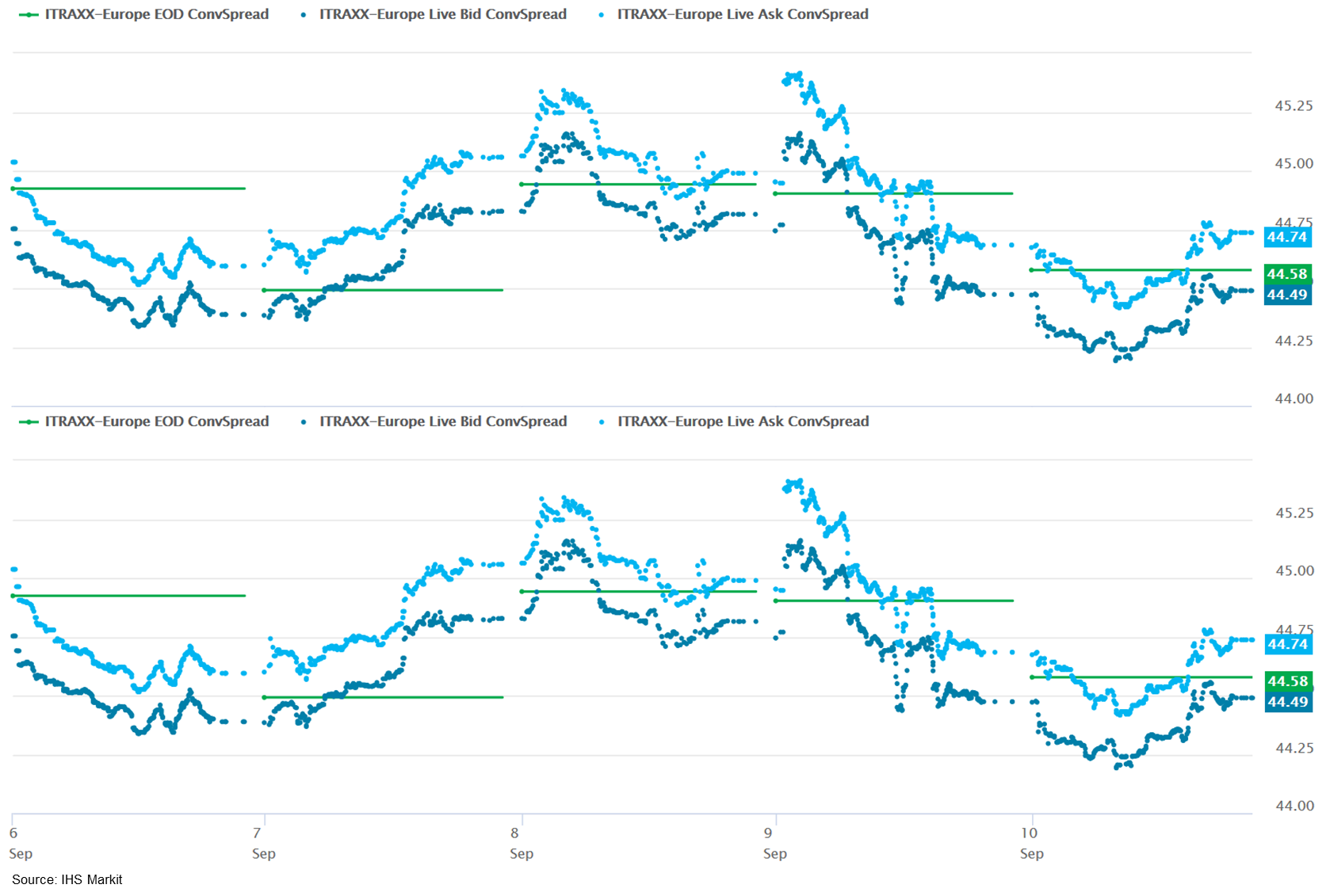 - iTraxx-Europe closed flat/45bps and iTraxx-Xover +1bp/227bps, which is flat and +1bp week-over-week, respectively.